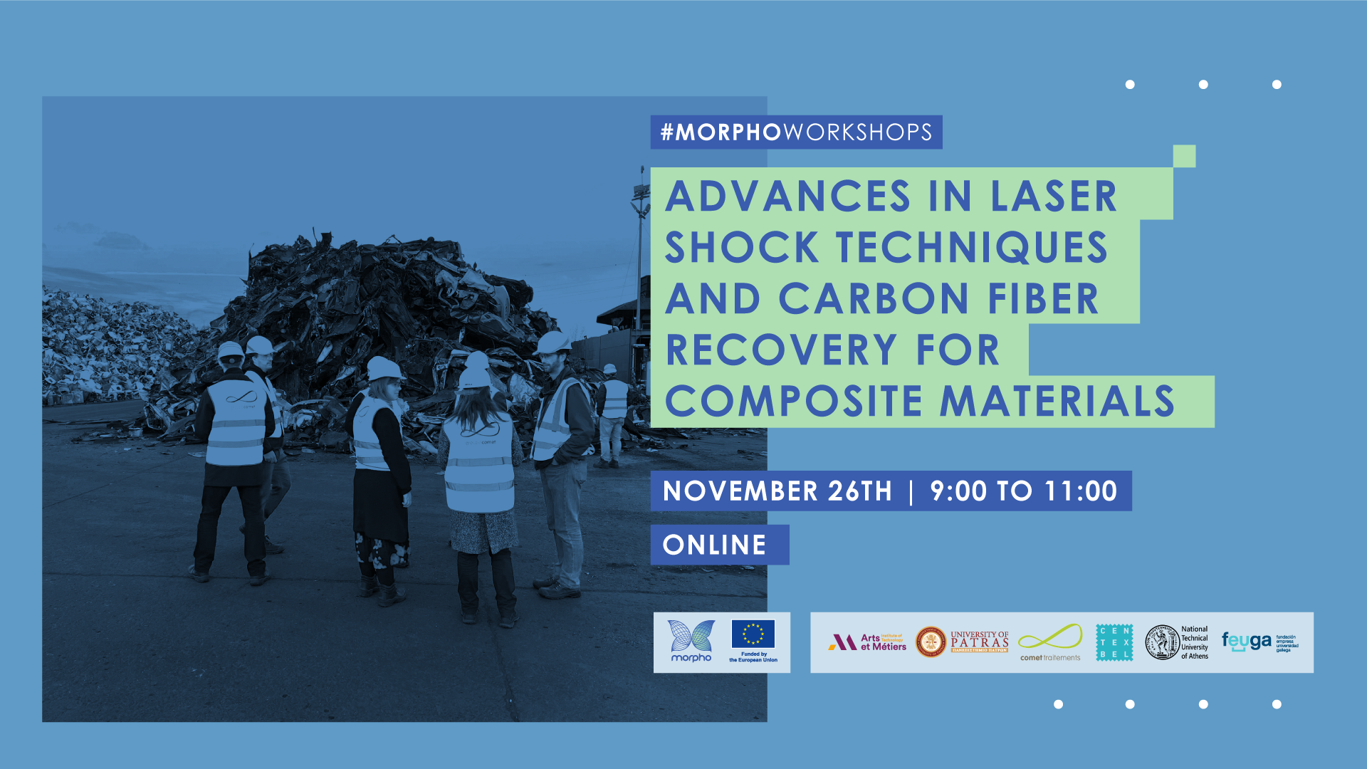 Join us for the MORPHO project workshop titled “Advances in Laser Shock Techniques and Carbon Fiber Recovery for Composite Materials.” This online event, scheduled for November 26th, from 09:00 to 11:00, will showcase the latest advancements in laser shock disassembly and carbon fiber recovery, with a focus on sustainability and innovation in composite materials.